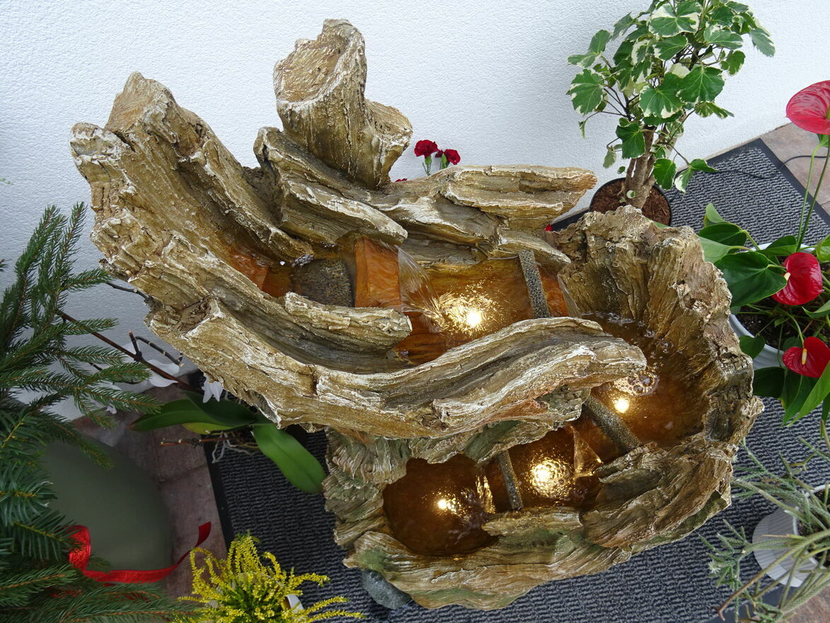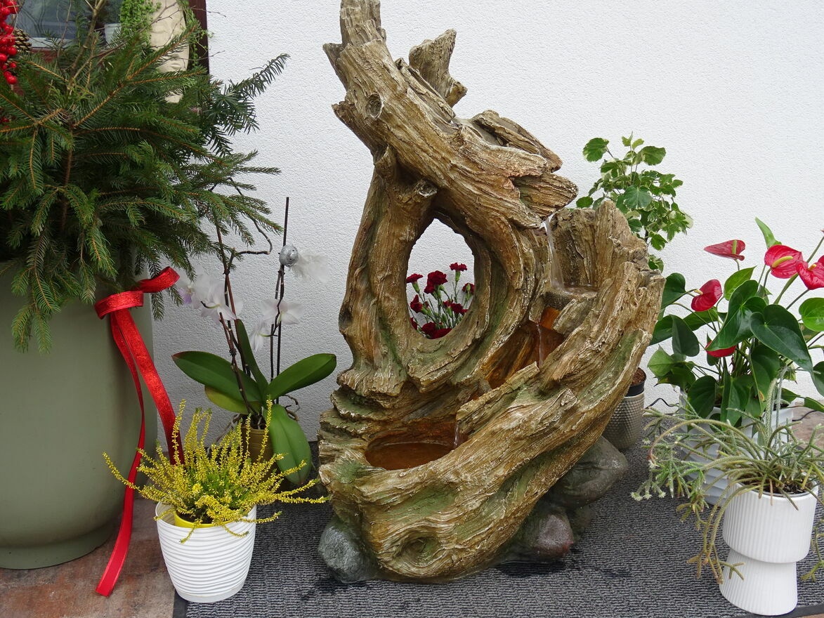 Fontanna w obiegu zamkniętym, woda w dolnym zbiorniku pompowana do górnego naczynia skąd kaskadowo – pod wpływem grawitacji spływa w dół …….. tu tego nie słychać ale jest to miłe i przyjemne doznanie zamykające oczy – można odczuć wrażenie przebywania blisko naturalnego strumienia ,