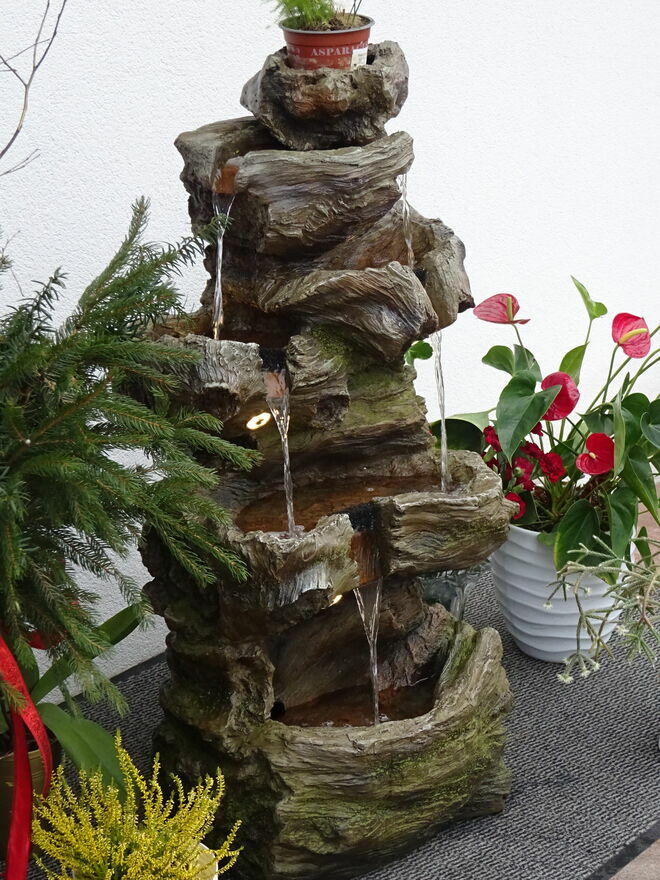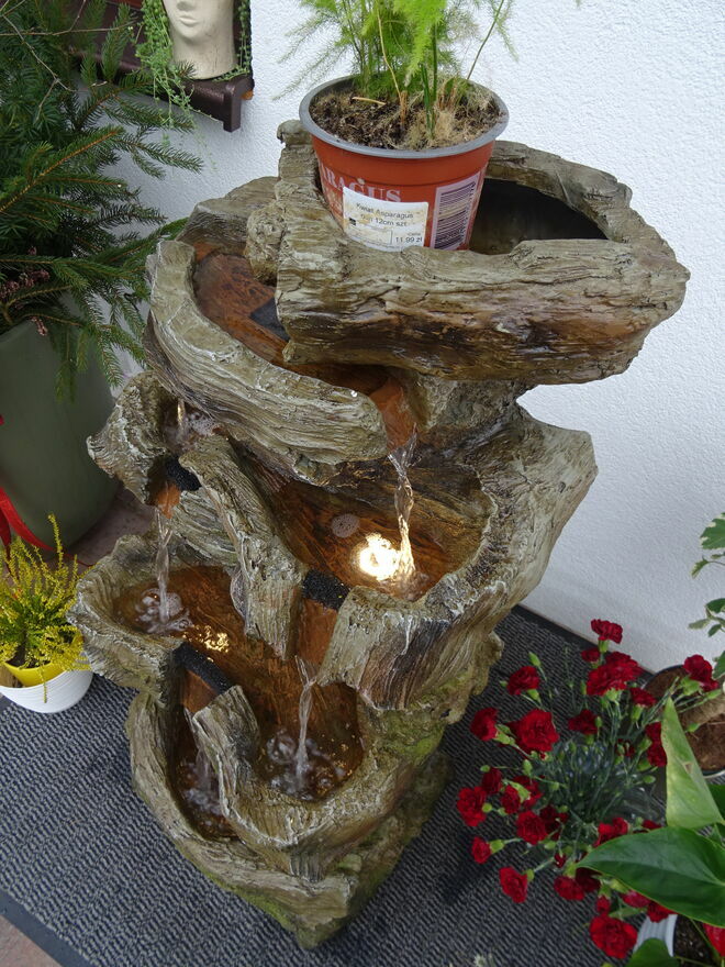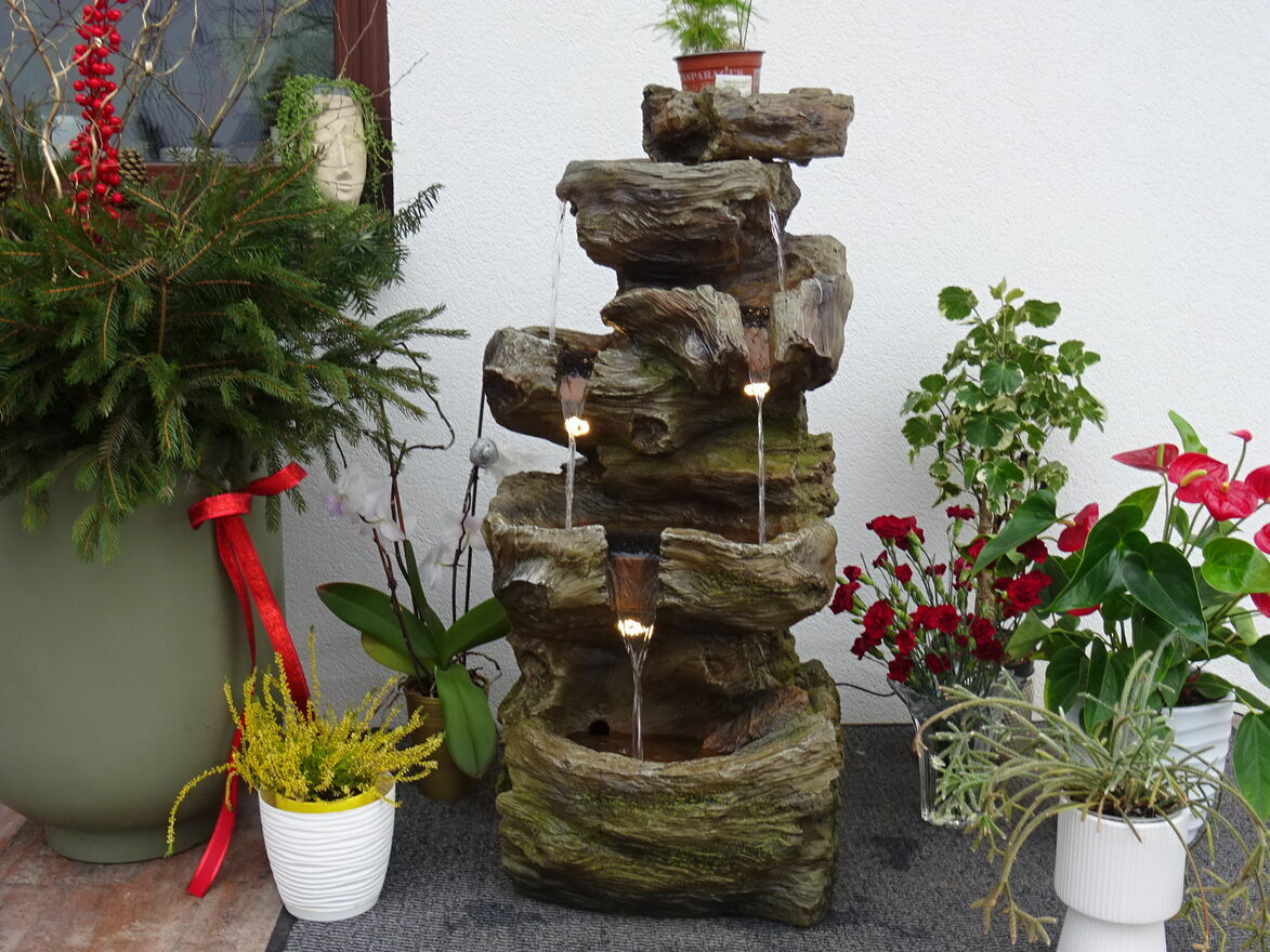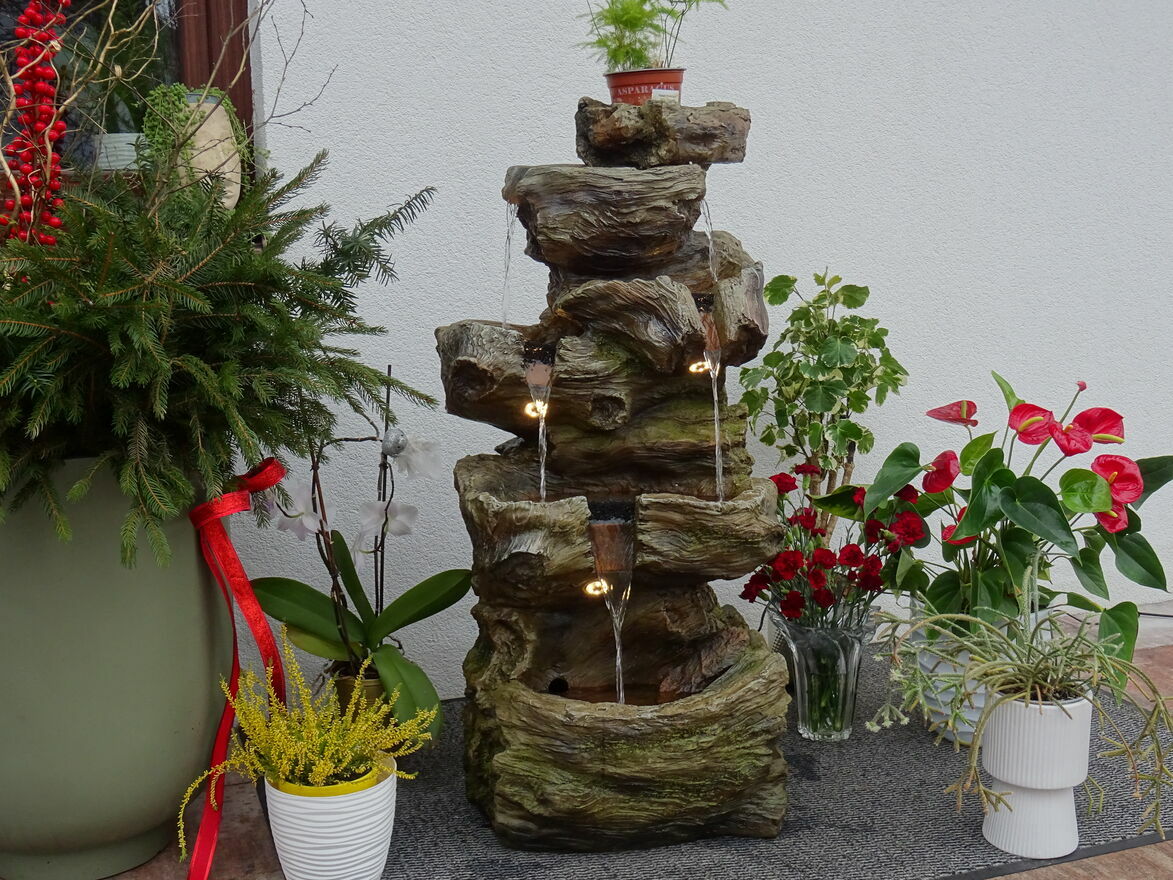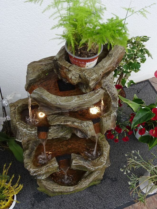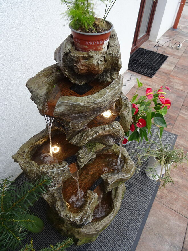 Fontanna w obiegu zamkniętym, woda w dolnym zbiorniku pompowana do górnego naczynia skąd kaskadowo – pod wpływem grawitacji spływa w dół …….. tu tego nie słychać ale jest to miłe i przyjemne doznanie zamykające oczy – można odczuć wrażenie przebywania blisko naturalnego strumienia ,