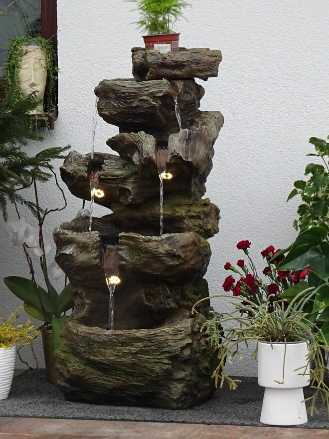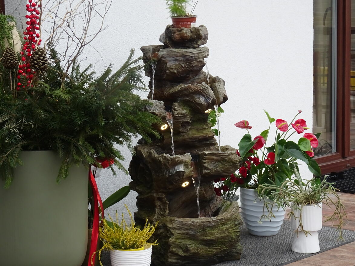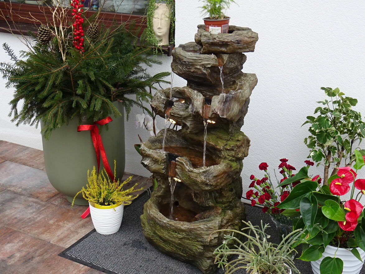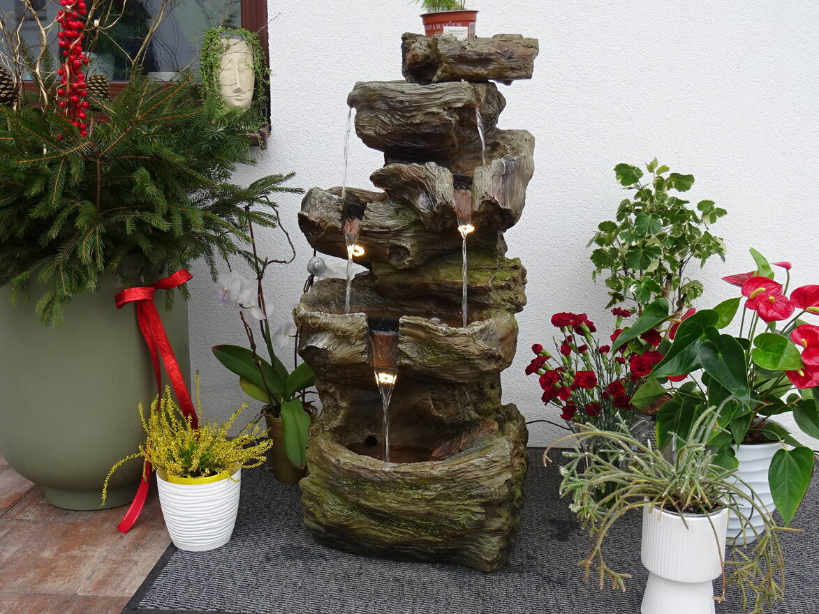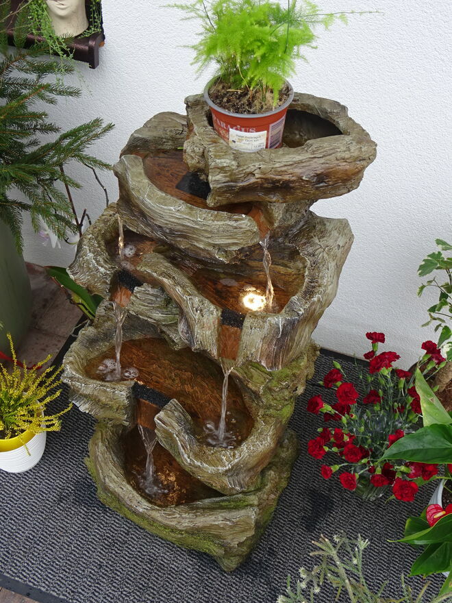 Fontanna w obiegu zamkniętym, woda w dolnym zbiorniku pompowana do górnego naczynia skąd kaskadowo – pod wpływem grawitacji spływa w dół …….. tu tego nie słychać ale jest to miłe i przyjemne doznanie zamykające oczy – można odczuć wrażenie przebywania blisko naturalnego strumienia ,