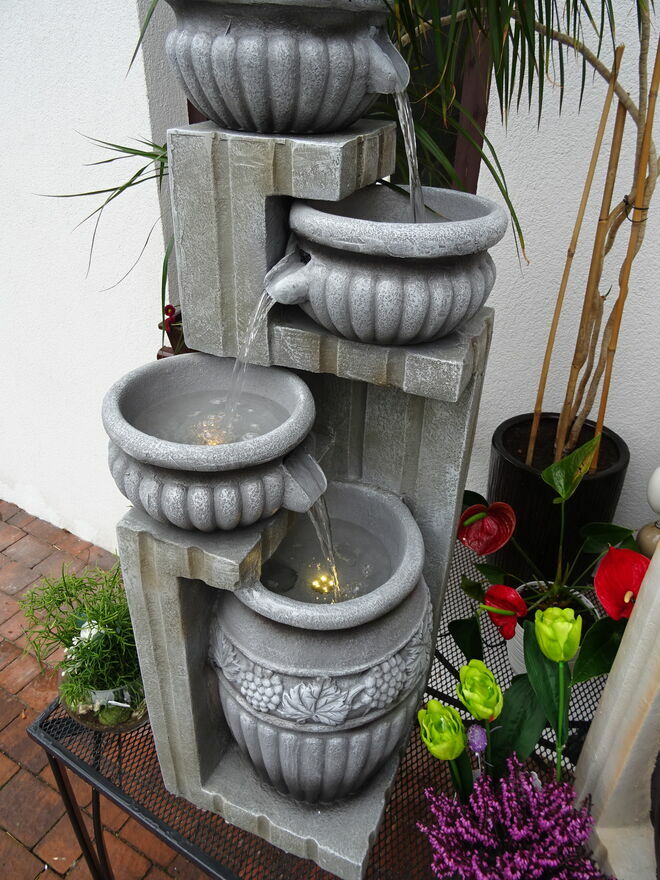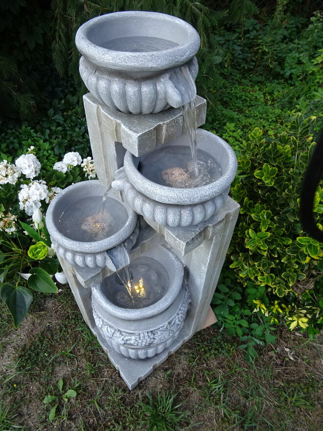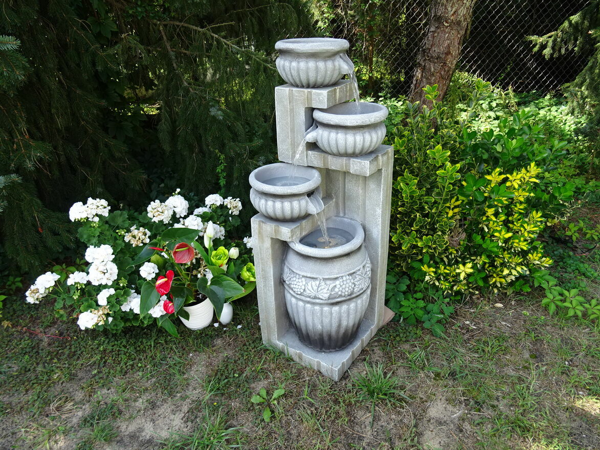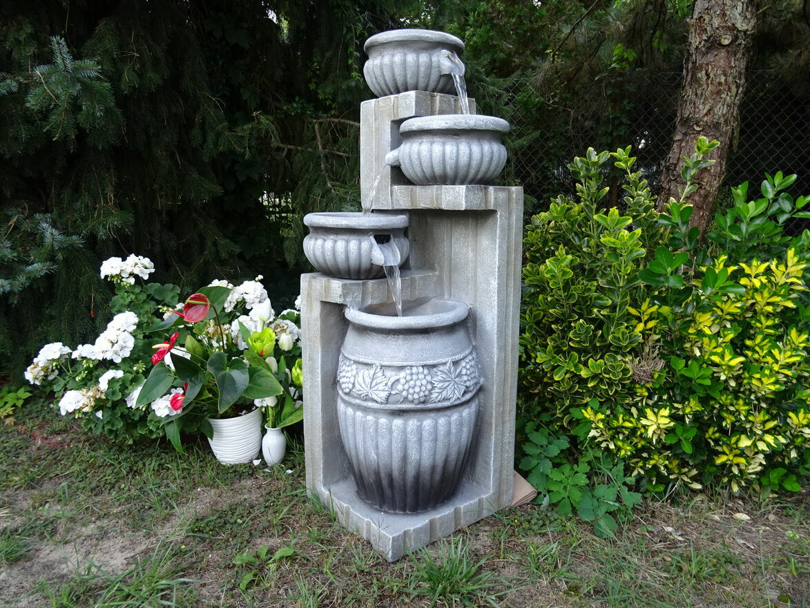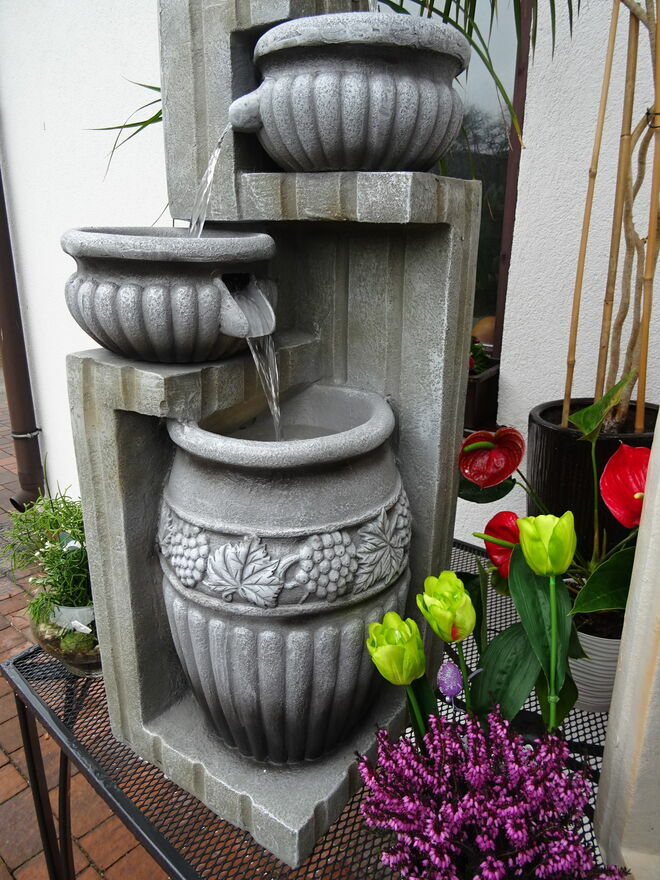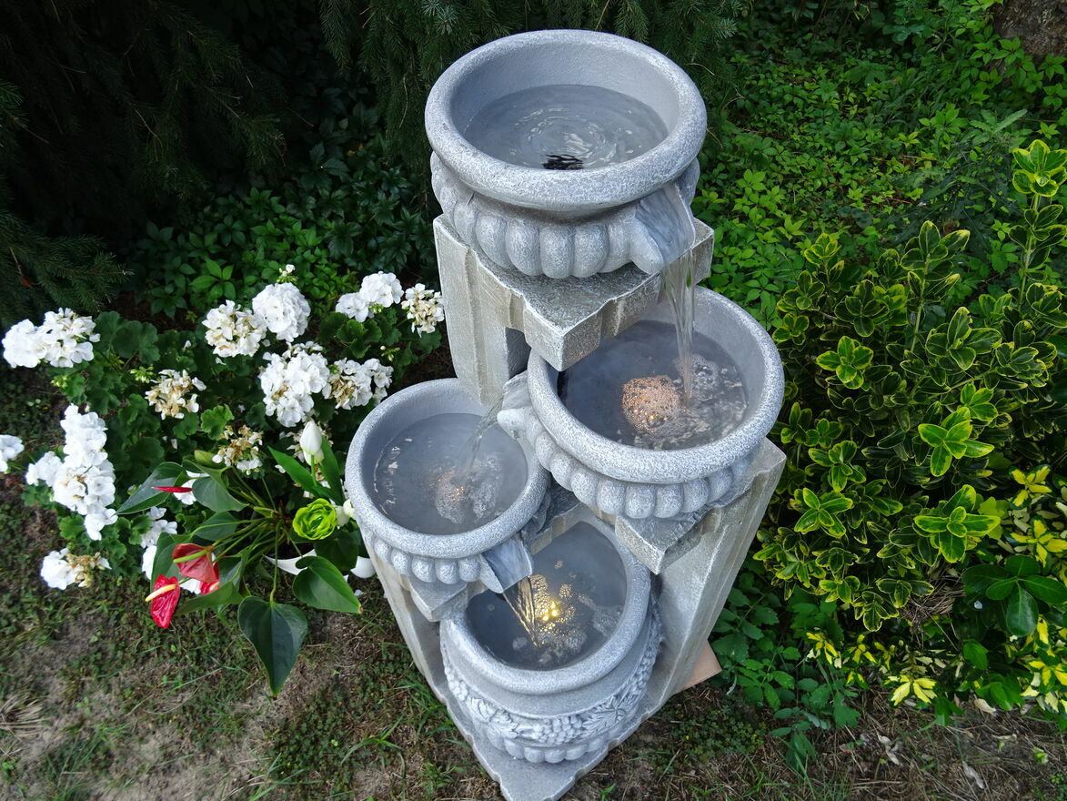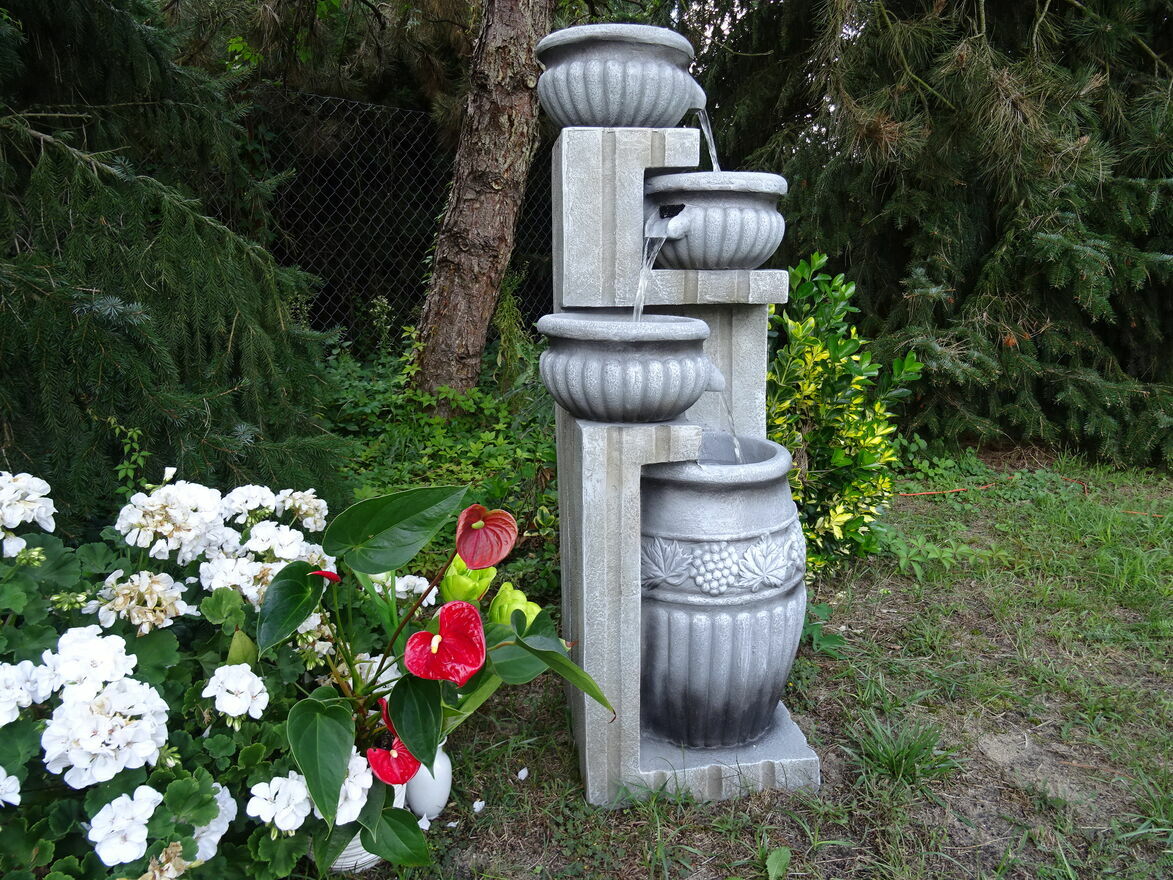 Fontanna w obiegu zamkniętym, woda w dolnym zbiorniku pompowana do górnego naczynia skąd kaskadowo – pod wpływem grawitacji spływa w dół , tu tego nie słychać ale jest to miłe i przyjemne doznanie zamykające oczy – można odczuć wrażenie przebywania blisko naturalnego strumienia ,